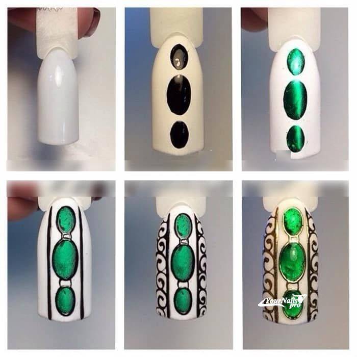 Эффектнее всего эти камни смотрятся на белой или черной подложке. Также рекомендуется использовать камуфляж. Можно покрыть ноготь рисунком полностью, а можно только частично, как показано на фото выше. В последнем случае для обрамления камня подойдет литье, гель-лак хроматик или густые блестки.