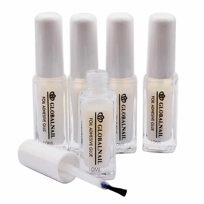 Для удобства нанесения такой клей оснащен кисточкой, его не нужно подсушивать в лампе, а о том, что клей готов к работе свидетельствует изменение цвета – из белого на прозрачный. Затем можно смело использовать фольгу, плотно прислонив ее к поверхности ноготка. При необходимости ее можно расправить, используя силиконовый или резиновый пушер. После завершения дизайна, поверх фольгового отпечатка наносят топ (если для основы был использован гель-лак) или закрепитель для обычного лака.