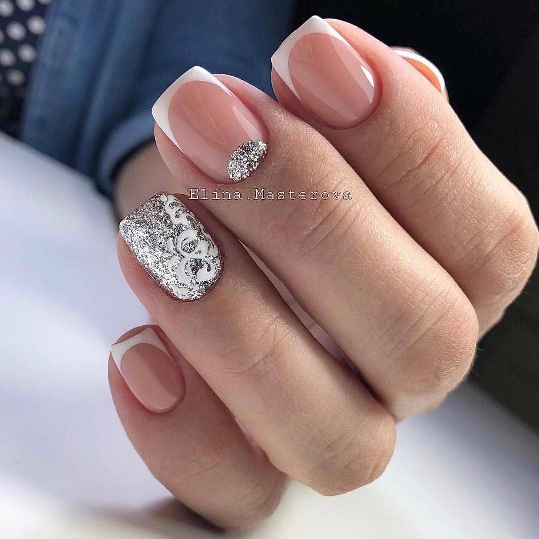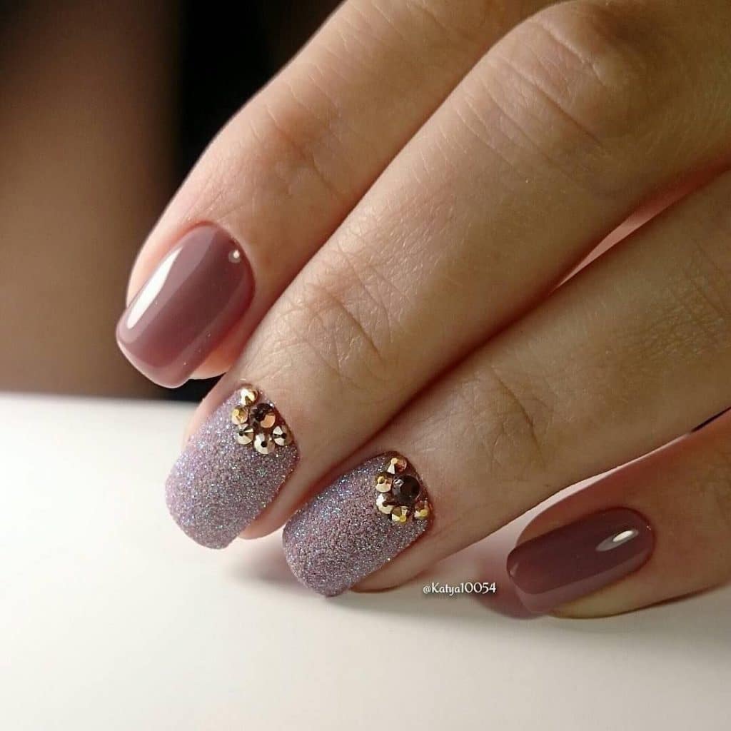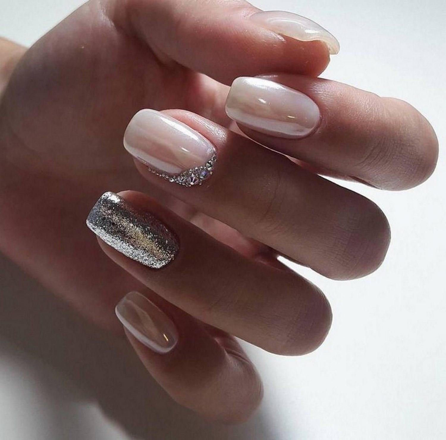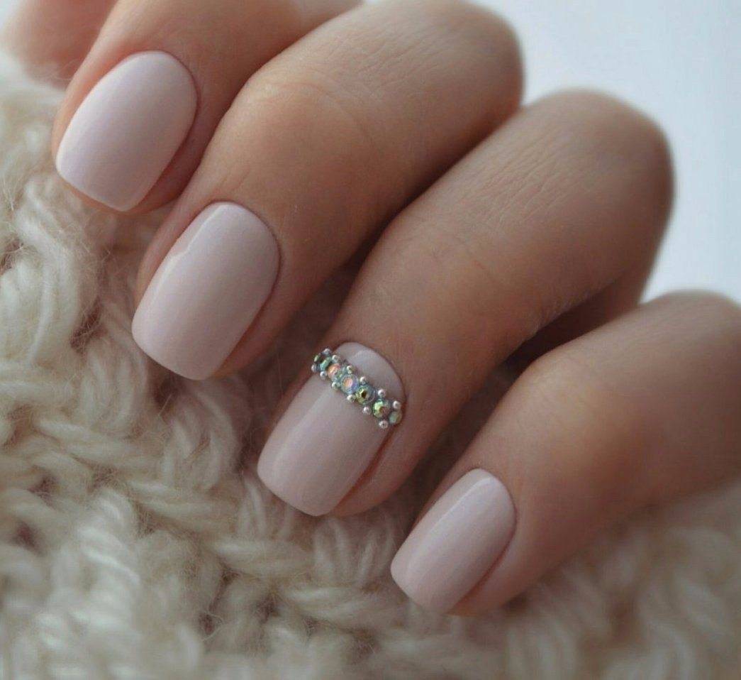 Изысканно смотрится нюдовый маникюр в сочетании со стразами, блестками или другим декором. Те, кто не привык к броскому оформлению, могут прибегнуть к блестящему напылению, приближенному к оттенку лака.