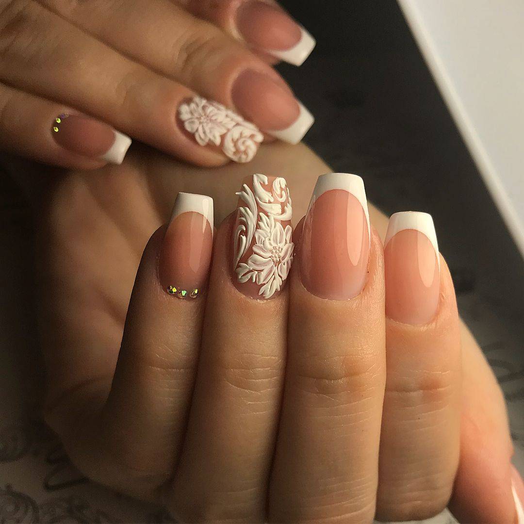 Как мы уже упоминали, квадратные ногти отлично дополняют любой маникюр. Лучшим вариантом в данном случае является французский маникюр: классический, с росписями, цветами, стразами или глиттером, он будет великолепно смотреться на квадратных ноготках.
