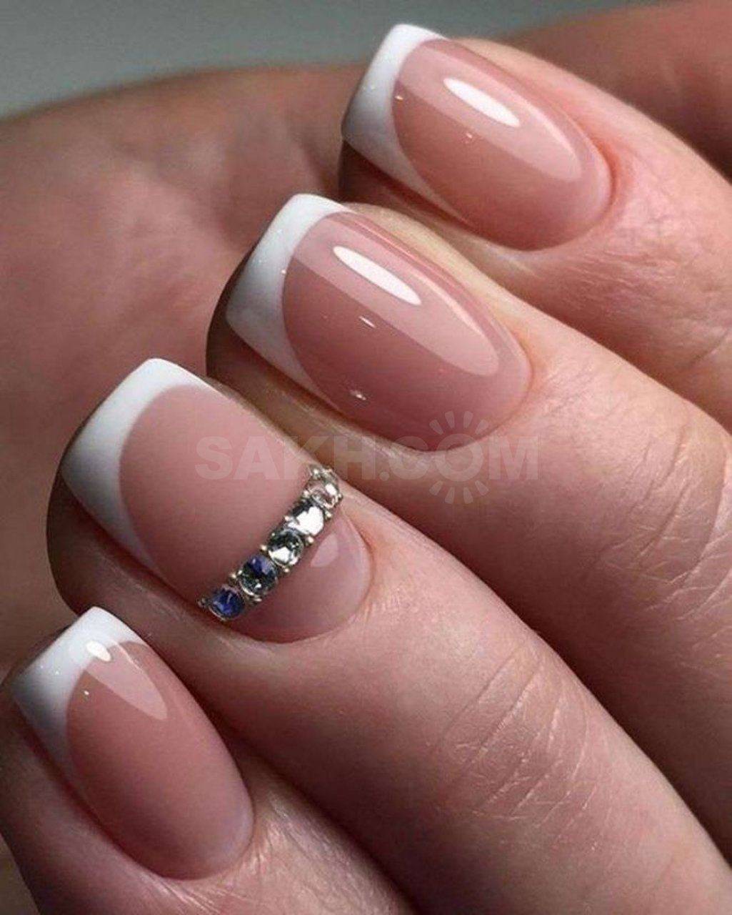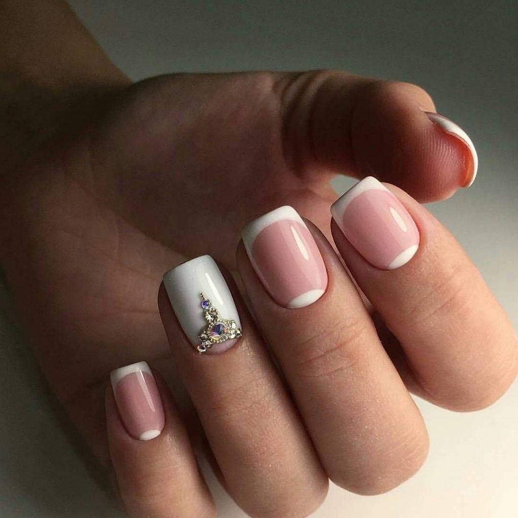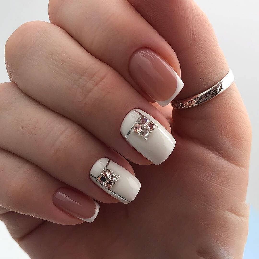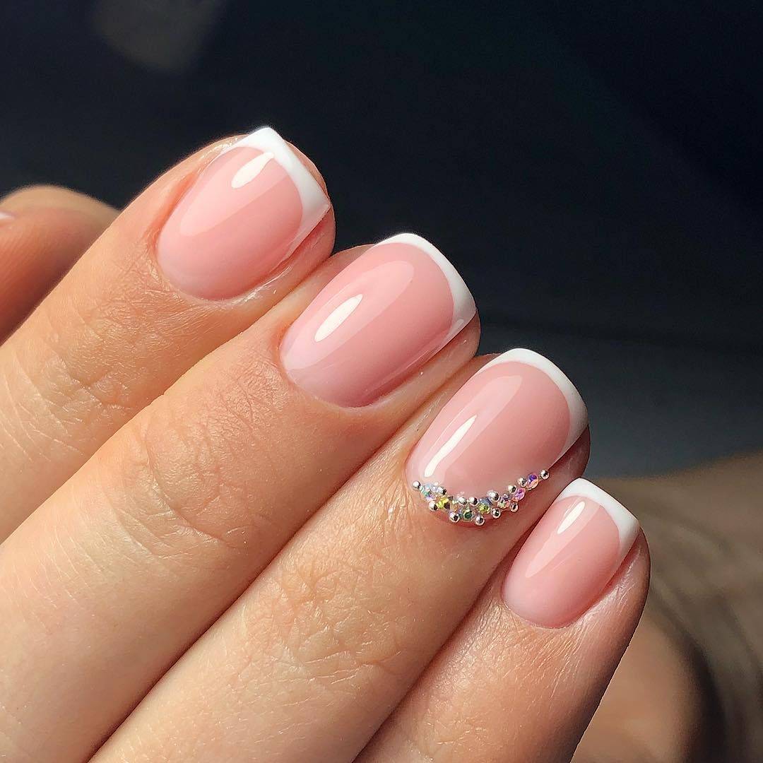 - Разнообразить незамысловатый френч и придать ему эффектности можно с помощью страз. Устанавливают их на топовое покрытие обычного лака или липкий слой гель-лака.