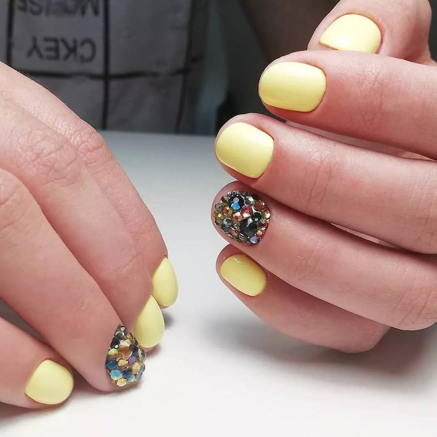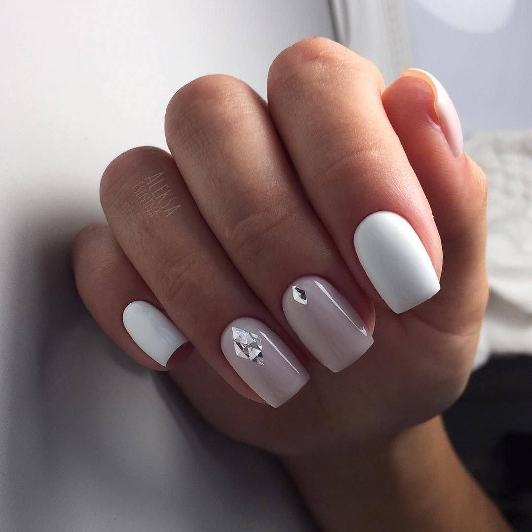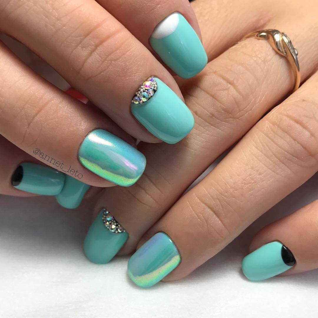 - стразы – на коротких ногтях используйте небольшое количество мелких стразов и бульонок. В тренде инкрустация стразами одного пальца и выкладка стразами в прикорневой зоне.
