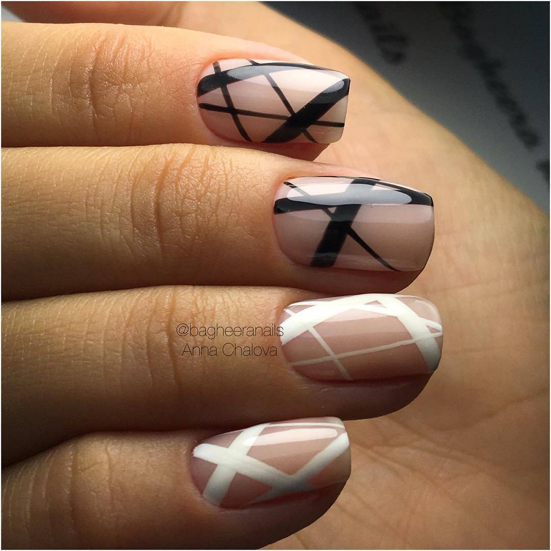 На фото использован дизайн в стиле «негативное пространство». Повторить его можно с помощью полосок для французского маникюра, которые приклеивают к ненакрашенной ногтевой пластине, после чего сверху наносят выбранный лак и снимают полоски, не дожидаясь высыхания лака.