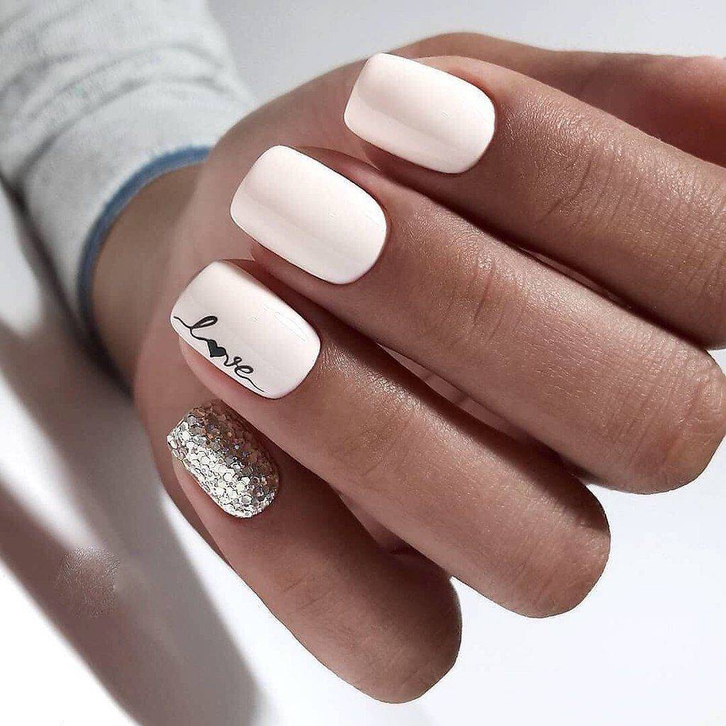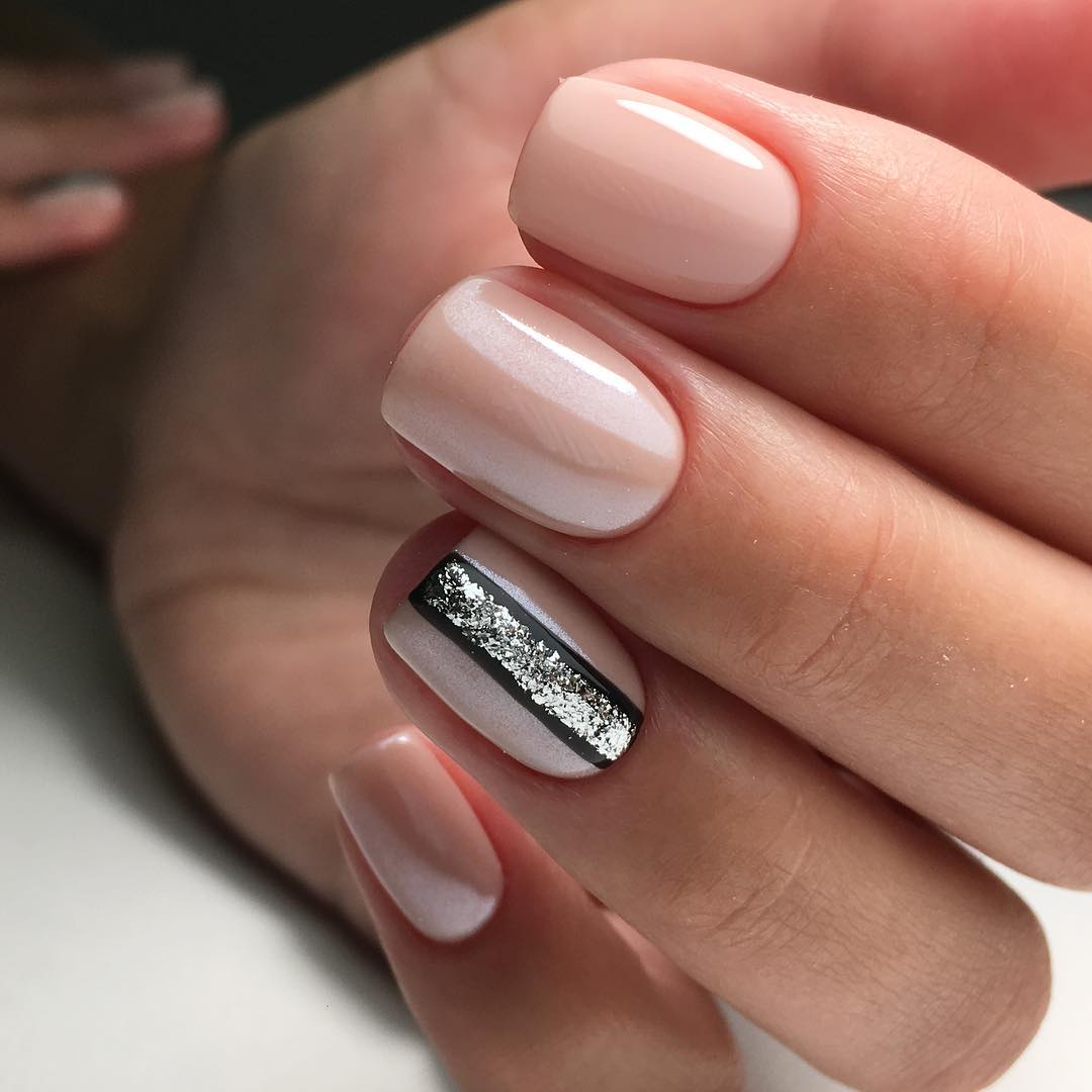 Короткие ногтевые пластины выигрышно смотрятся с нежными оттенками и мелким шиммером.
