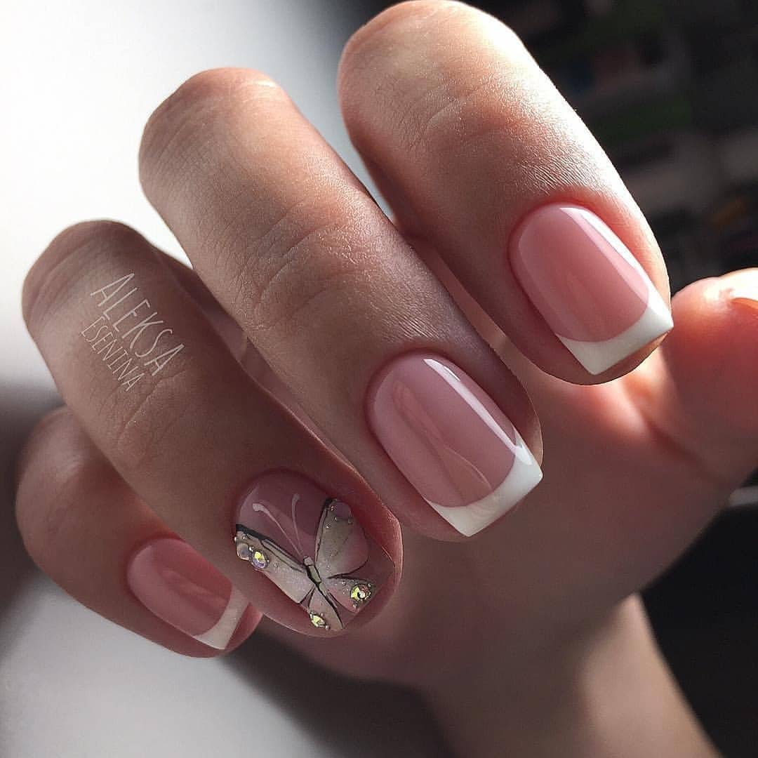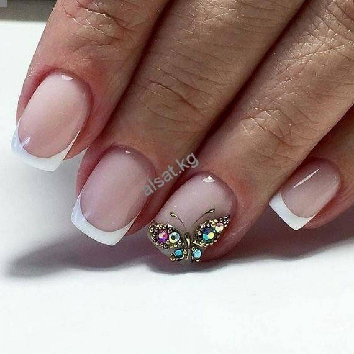 - Нюдовый оттенок идеально гармонирует с изящной бабочкой, выполненной тоненькой кисточкой. Богатства маникюру придают стразы.