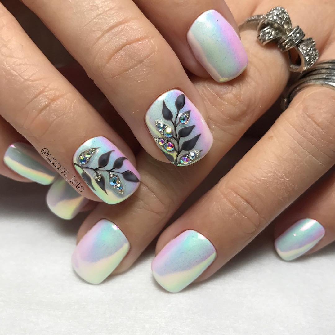 Очень красиво выглядит однотонное покрытие с использованием специальных втирок. Особенно классно смотрятся жемчужные оттенки начиная от молочного заканчивая грифельным, так же не теряет популярности и цвет металлик, но он уже не будет таким популярным как в 2017. На его смену приходят новые решения, такие как радужный оттенок, когда ногтевая пластина переливается всеми цветами радугами, хамелеон (под определенным углом света меняет оттенок).