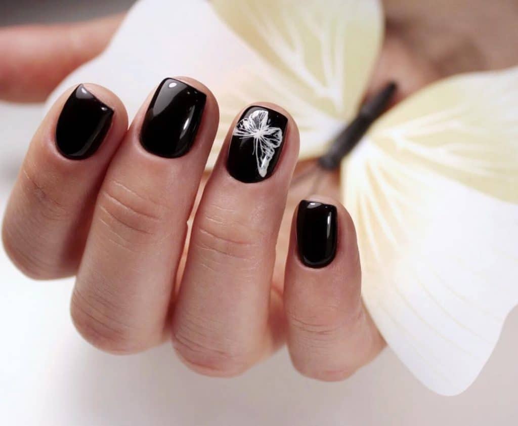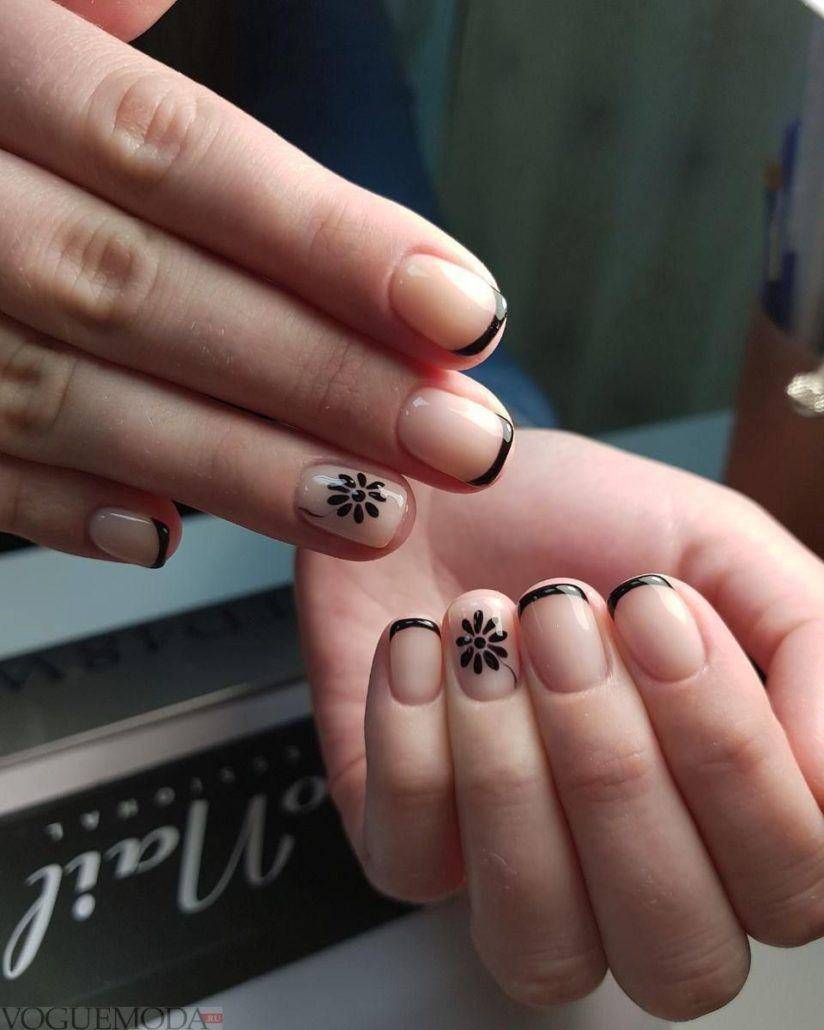 - флористика – в тренде маникюр минимализм с аккуратными веточками, листьями, бутонами в черном матовом исполнении