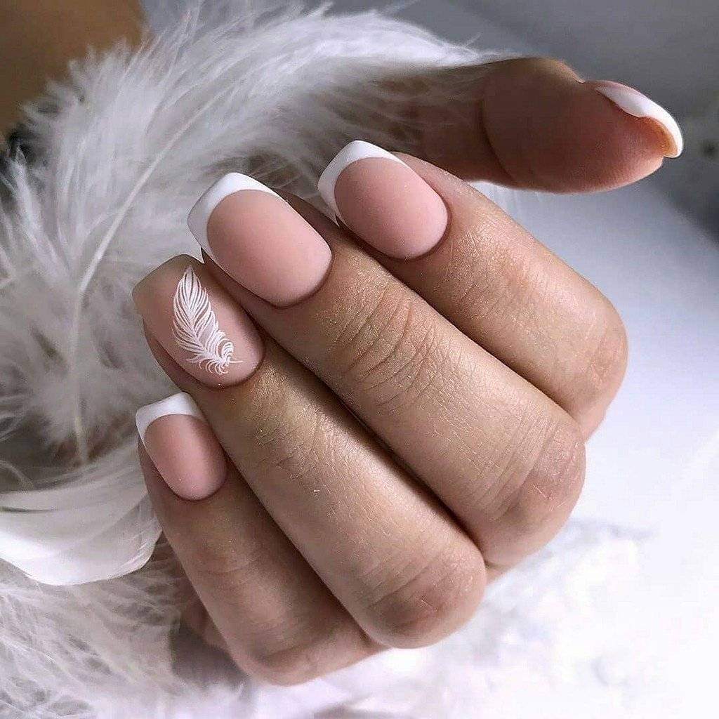 - Нюдовый оттенок в сочетании с френчем – нестареющая классика. Дизайн дополнен техникой «лунный маникюр».