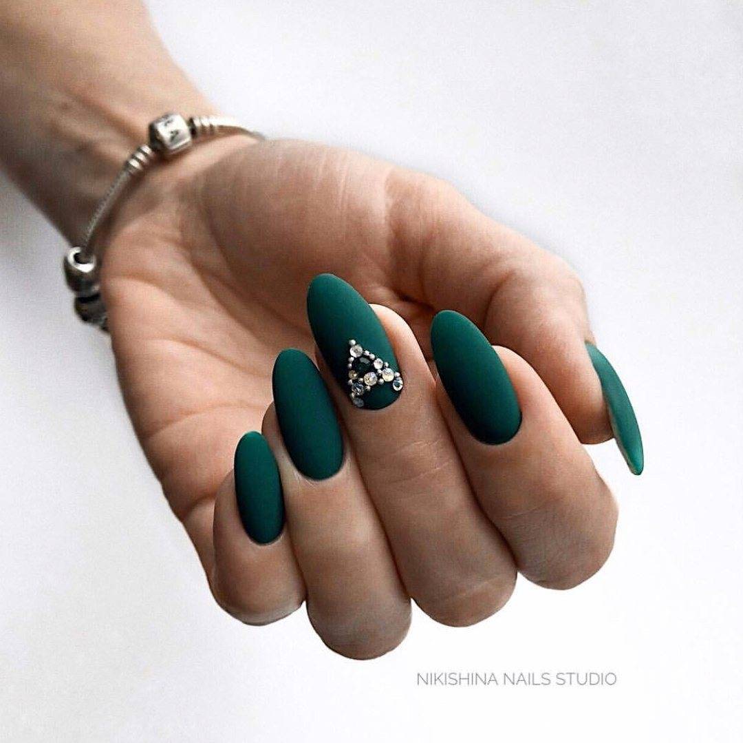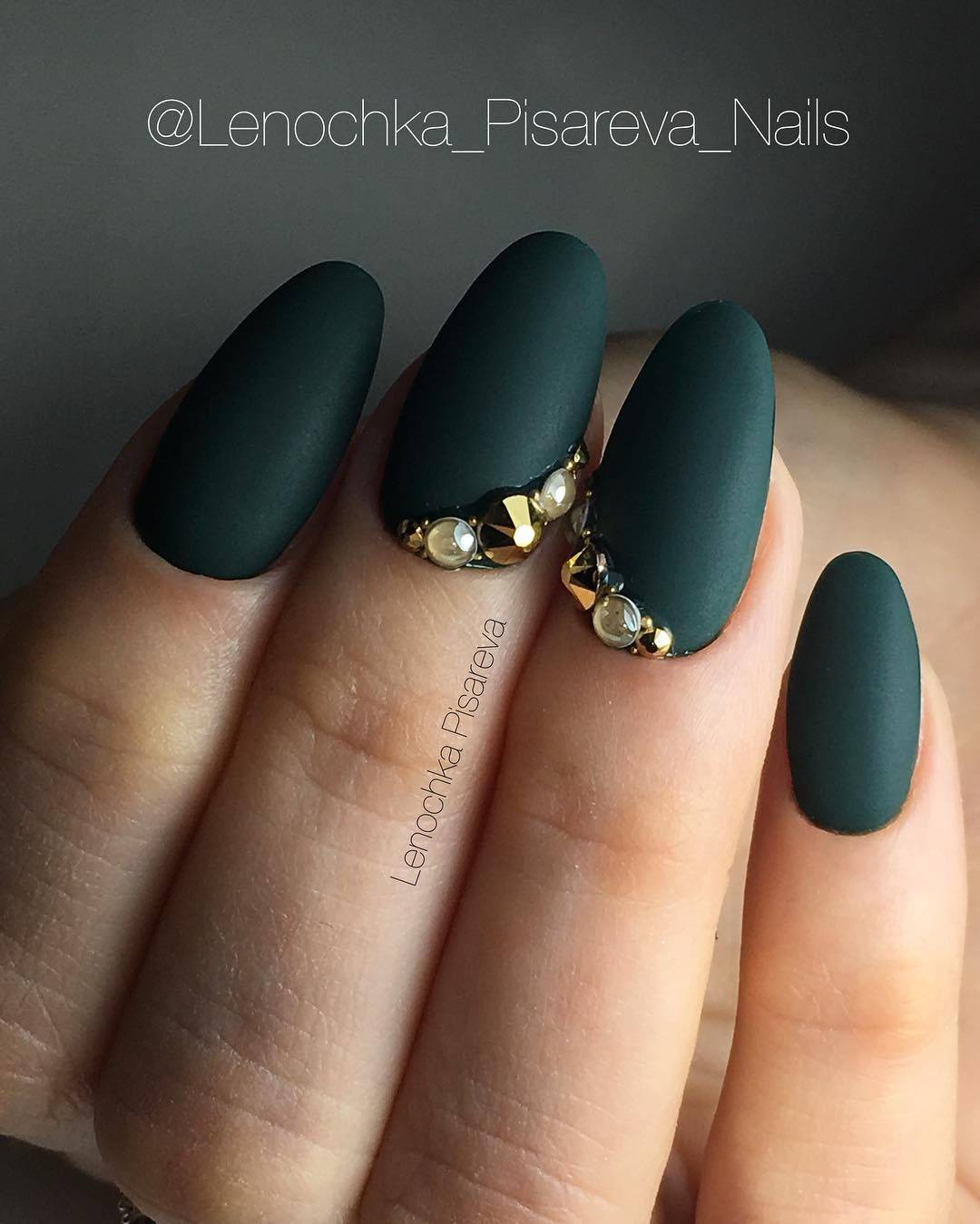 Сейчас на пике моды матовый маникюр без глянца, его выполняют в каком угодно оттенке, включая и глубокий зеленый. Подобный маникюр оптимально выглядит в основной цветовой гамме, но можно дополнить его какими-либо украшениями: стразы, слайды, рисунки, песок в оттенках золота.