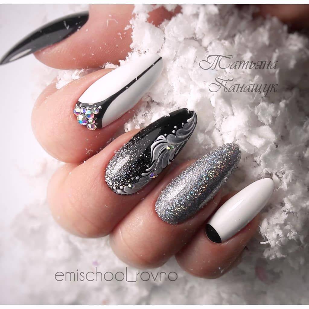 Если соединить эти два противоположных цвета, то получится десятки интересных нейл-артов с геометрией, флористикой, растяжкой цвета, градиентом. Черно-белый маникюр – отличное решение для деловых и повседневных образов. В тренде однотонный маникюр с поочередным окрашиванием ногтей черным и белым цветом, выделением 1-2 ноготков серебряным глиттером.