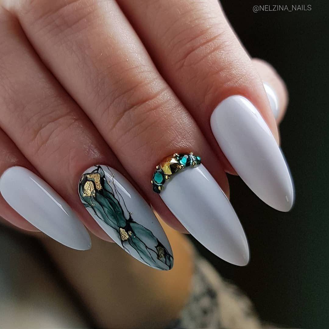 Профессиональные нейл-мастера рекомендуют дополнять изумрудный маникюр таким декором как стразы, серебряная или золотая фольга, глиттер, слайдеры и т.д. В однотонном варианте изумрудный маникюр может смотреться бледно и банально. Даже если в вашем распоряжении нет украшений, то вы всегда можете создать потрясающий маникюр, в котором сочетается матовая и глянцевая текстуры.