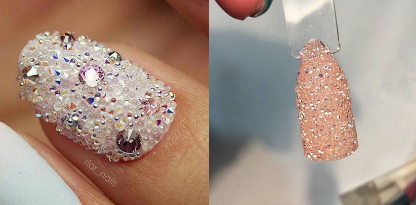 - Большое количество мелких камешков зрительно придадут ему вес и объем, потому лучше оставить такое украшение для длинных ногтей, а на коротких ограничиться небольшим количеством или орнаментом.