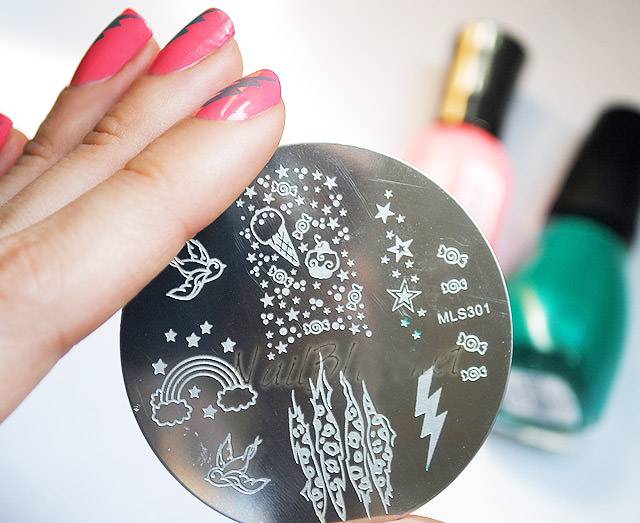 Еще одним отличным вариантом, который правда не сделаешь в домашних условиях, является стемпинг. В состав набора для домашнего использования входит специальная металлическая палетка, на которой вырезаны объемные рисунки, штамп, выполненный из резины, которым переносится выбранный рисунок на ноготь, а также специальный для такого дизайна лак. Рисунки могут быть самыми разнообразными, что позволяет подобрать маникюр к конкретному случаю.