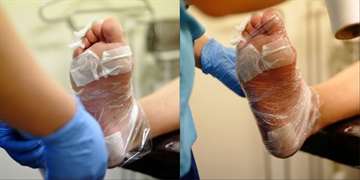 - По истечении времени носки и плёнку снять, стопы тщательно протереть влажными салфетками.