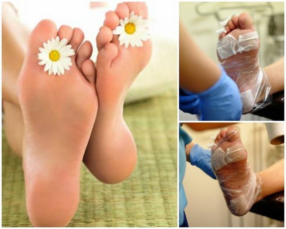Обработав все огрубевшие участки стоп, нужно укутать ножки целлофановыми пакетиками. Данный состав нужно оставить на ногах на определённое время. Точное время производители обычно указывают на упаковке, обычно это 10-15 минут. По истечении этого времени верхние слои кожи размягчаются и отслаиваются.