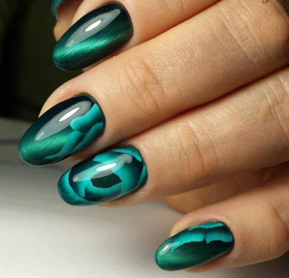 Дизайн с использованием изумрудно-синего оттенка отлично подойдет для повседневной жизни. Маникюр дополнит любой образ, сделает ручки ярче. Также такие оттенки отлично подходят девушкам с голубыми или зелеными глазами.