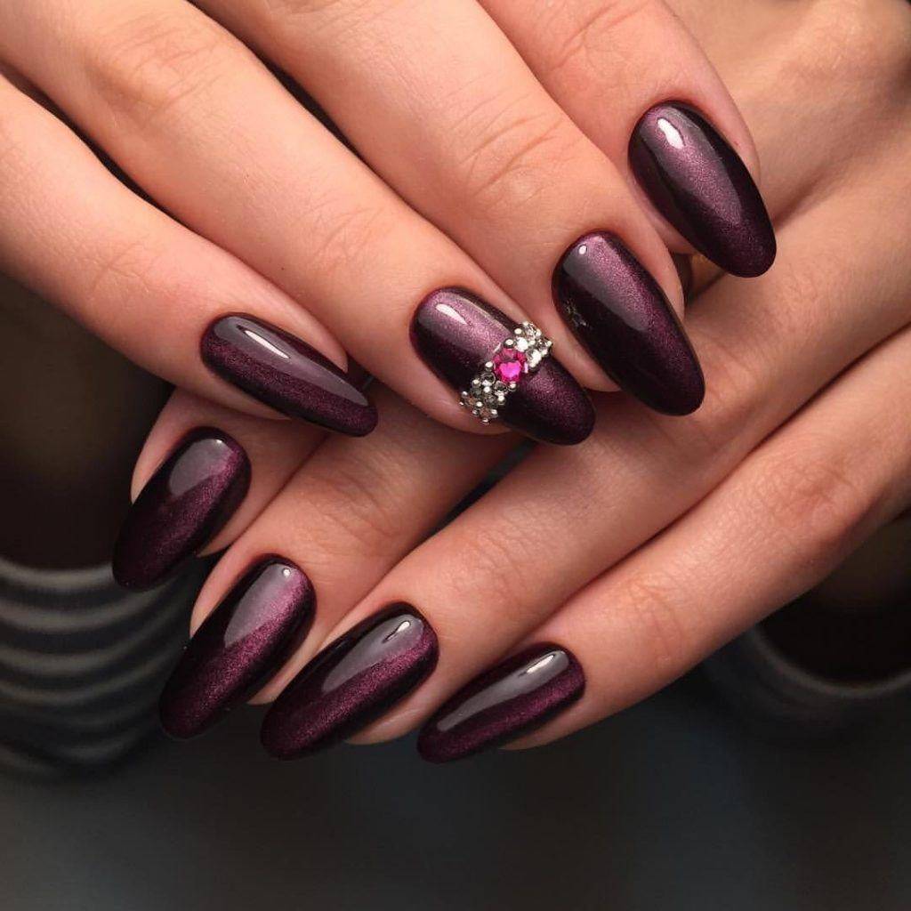 Безымянный палец вполне уместно украсить контрастными элементами. Еще более роскошно будут выглядеть темные ноготки со стразами разных форм и размеров. Достаточно украсить ими один или два пальца. Вместо камушков можно декорировать ноготки абстрактными узорами или вензелями.