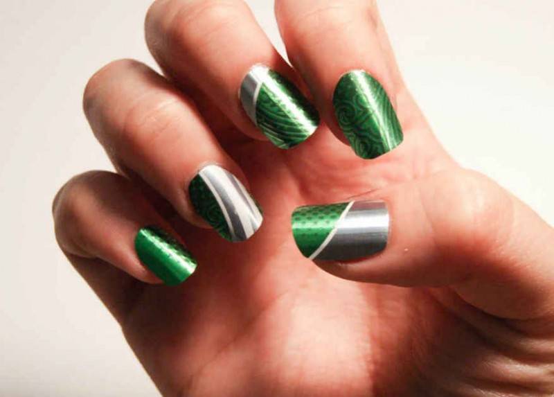 Скотч-лента для дизайна ногтей в два счета решает проблему заготовки тонких полосок! Стоит лишь приобрести необходимые цвета в магазине и использовать их для выполнения идеально ровного маникюра. При помощи готовых тонких полосок вы можете сделать маникюр любой сложности. Скотч-лента, кстати, может быть оставлена на ноготках – такой маникюр выглядит невероятно красивым, а главное, ваши ноготки всегда будут переливаться на солнце за счет блестящей поверхности ленты.