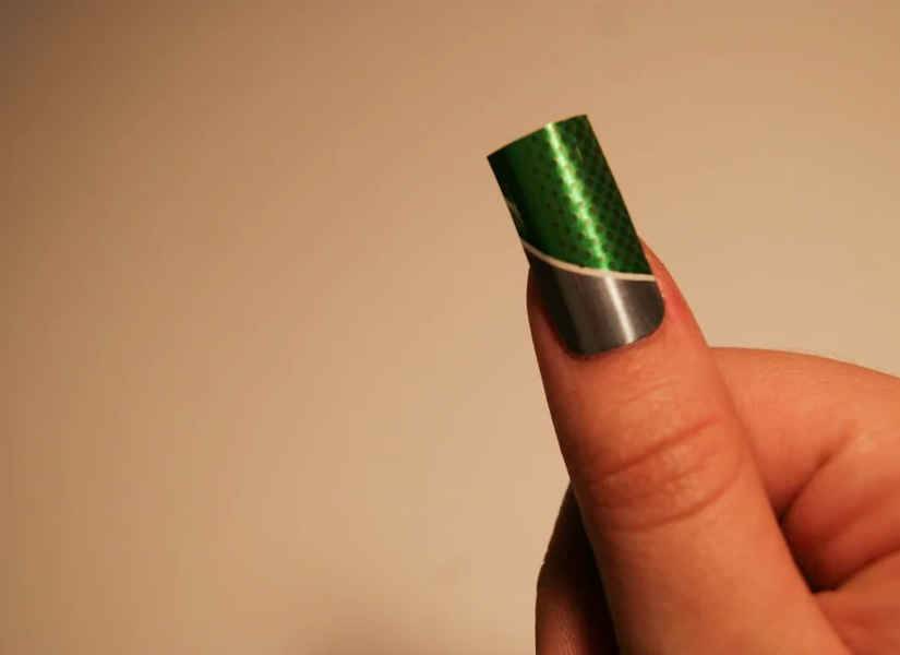 Маникюр скотчем занимает много времени из-за его нарезки. На ножницах остаются кусочки клея, а вашего терпения хватает лишь на то, чтоб сделать дизайн нескольких ногтей.