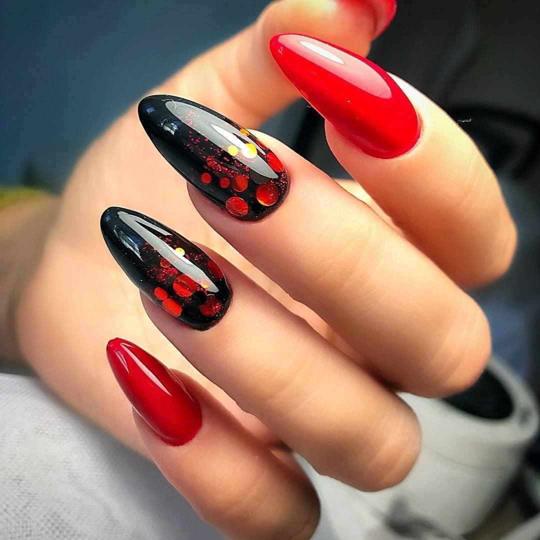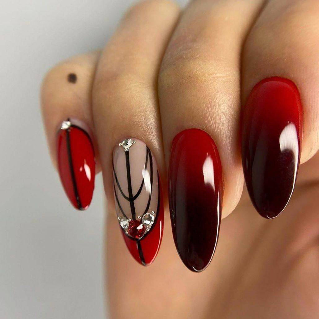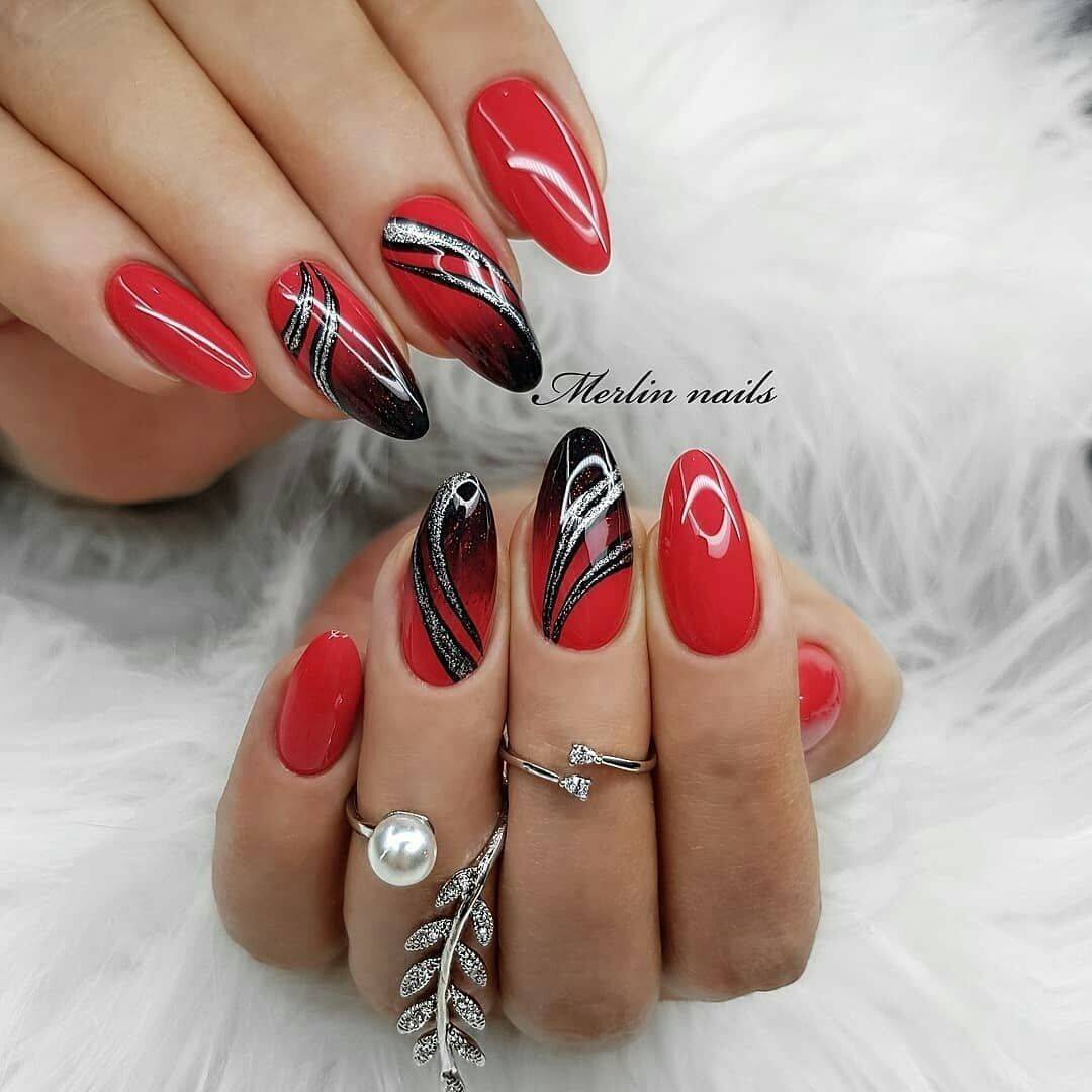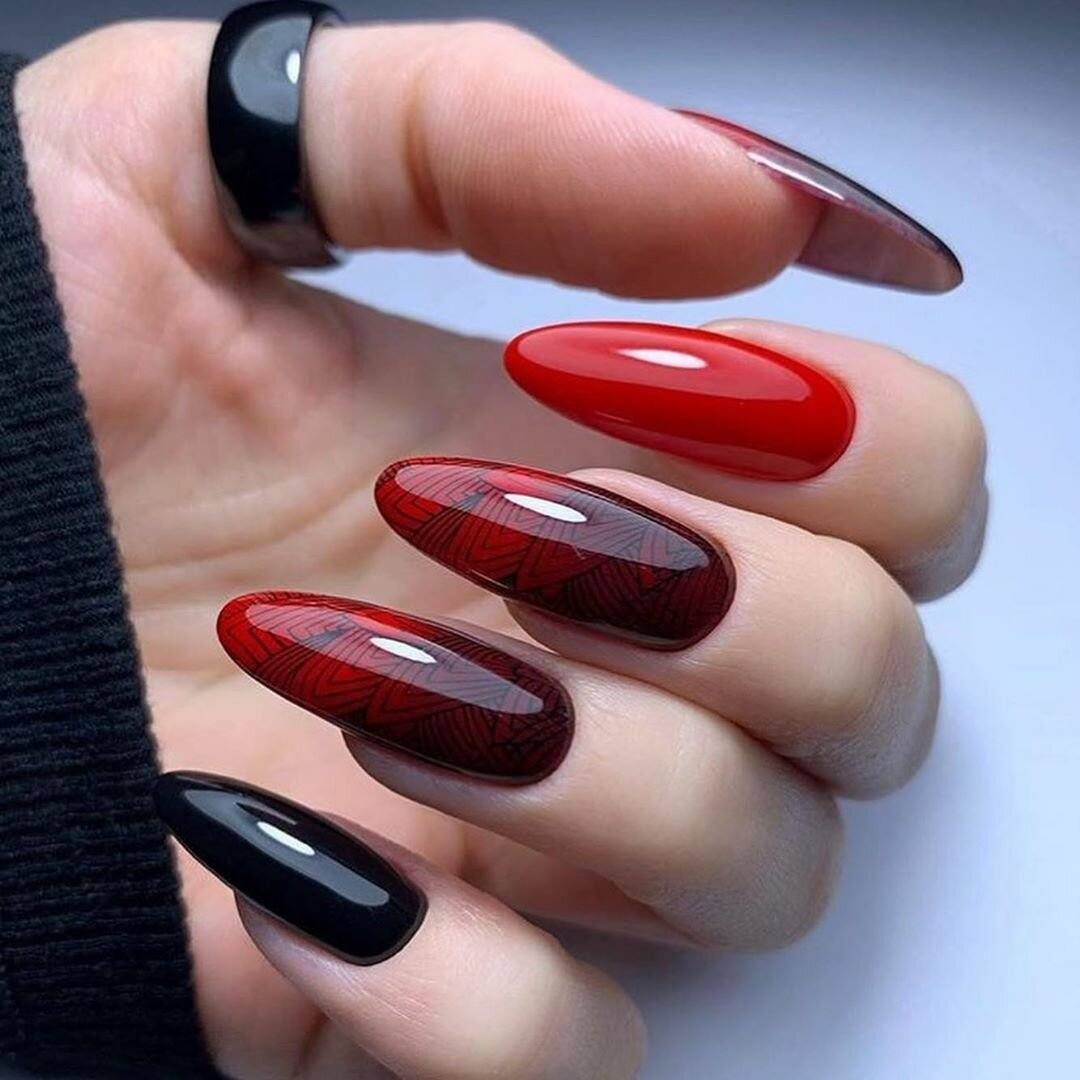 Сочетание двух строгих, выразительных цветов красного и черного на ногтях смотрится броско. Современные нейл мастера для создания неповторимого дизайна играют с палитрой, используя разные техники. Это градиент, кружево, «negative space», «color block» или строгая геометрия. Каждая из них актуальна в этом году. Для украшения подойдет битое стекло, камифубуки или фольга.