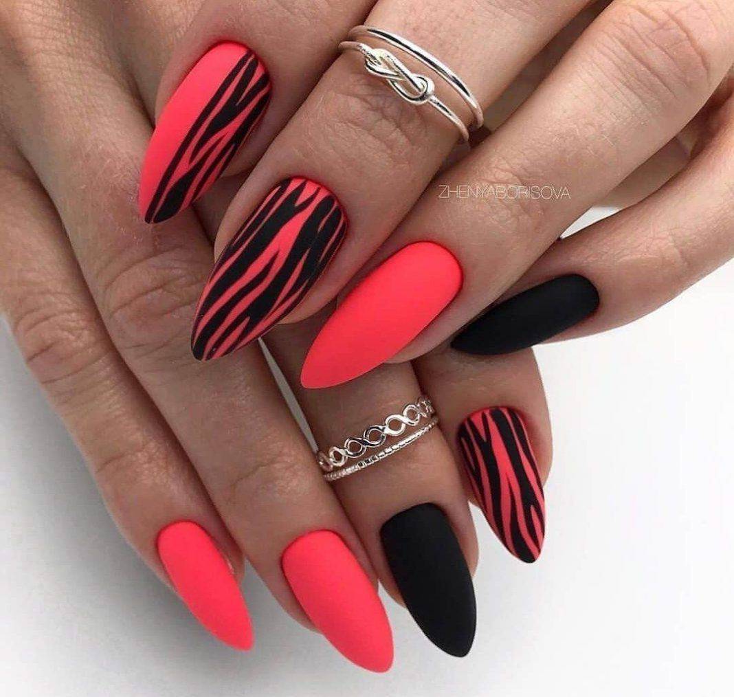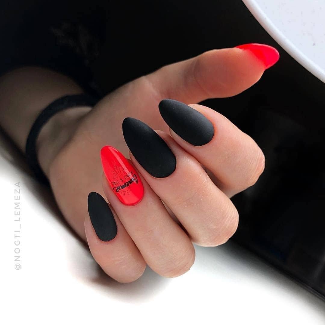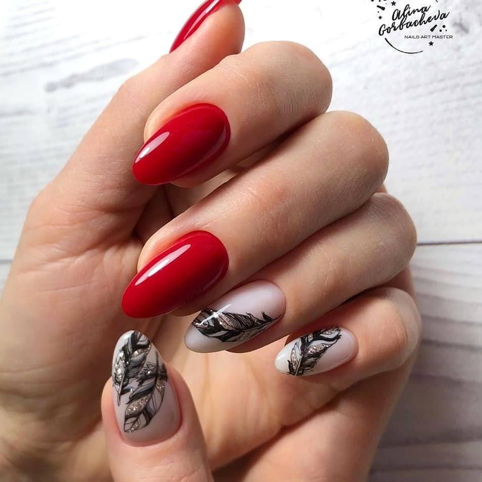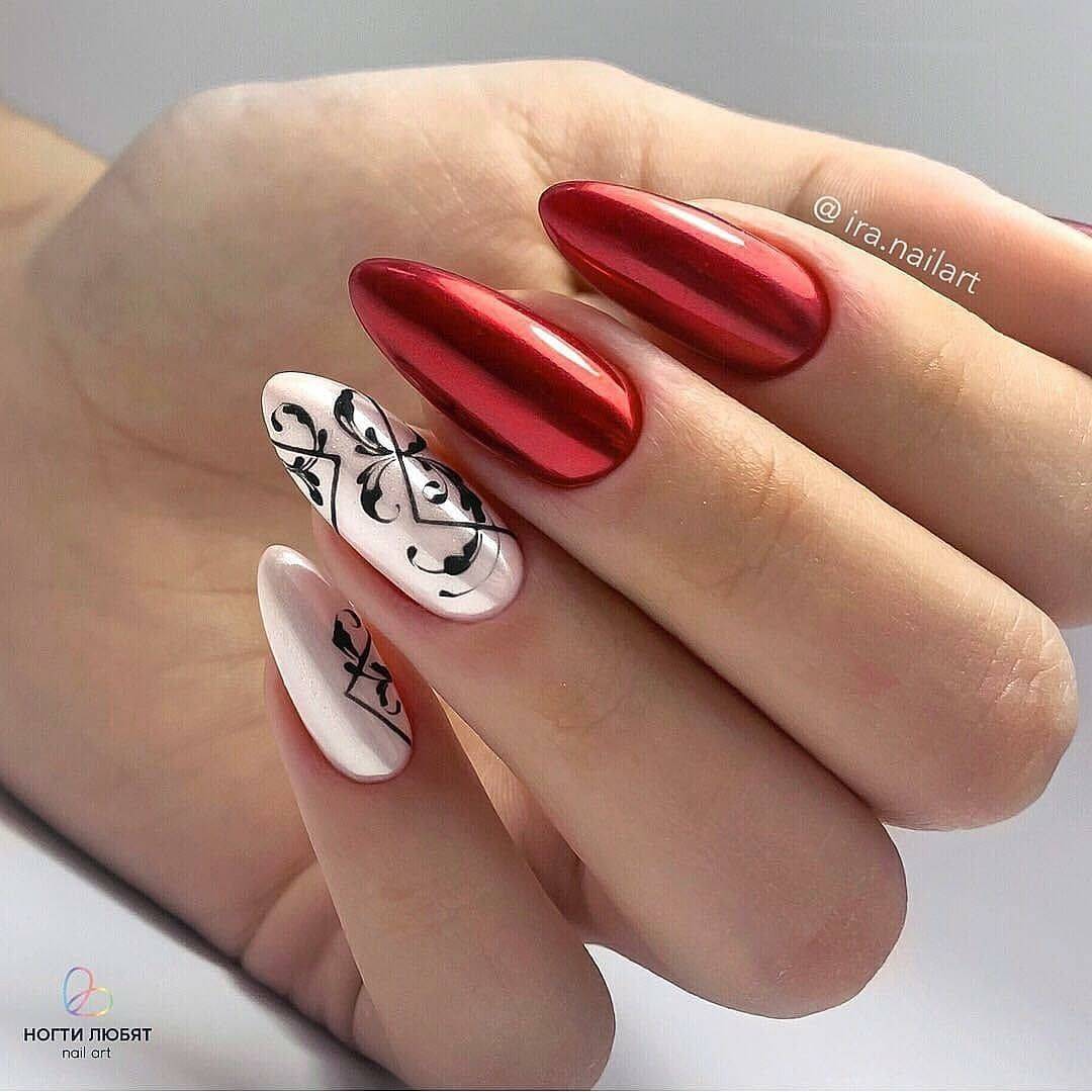 Сочетание двух строгих, выразительных цветов красного и черного на ногтях смотрится броско. Современные нейл мастера для создания неповторимого дизайна играют с палитрой, используя разные техники. Это градиент, кружево, «negative space», «color block» или строгая геометрия. Каждая из них актуальна в этом году. Для украшения подойдет битое стекло, камифубуки или фольга.