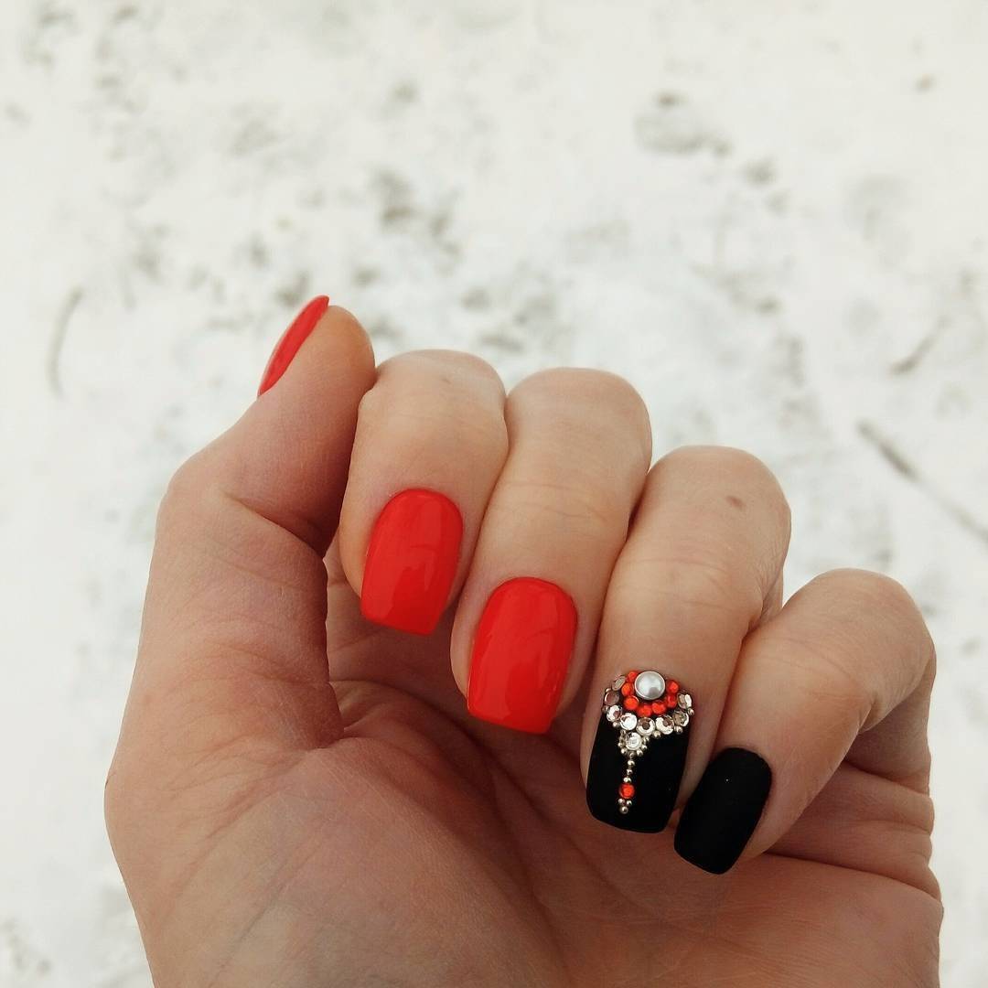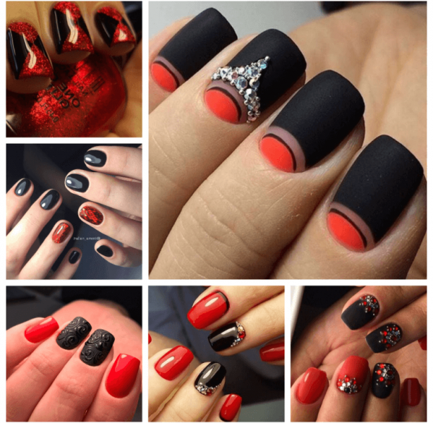 В оформлении ногтей часто используется сочетание оттенков, что позволяет создавать гораздо больше вариантов дизайна. В данном случае, красно-черный маникюр уже считается классикой, независимо от выбранного рисунка. Среди самых популярных вариантов можно выделить френч, лунный дизайн, абстракцию и многое другое. Дополнение в виде страз добавляет маникюру яркости и блеска.
