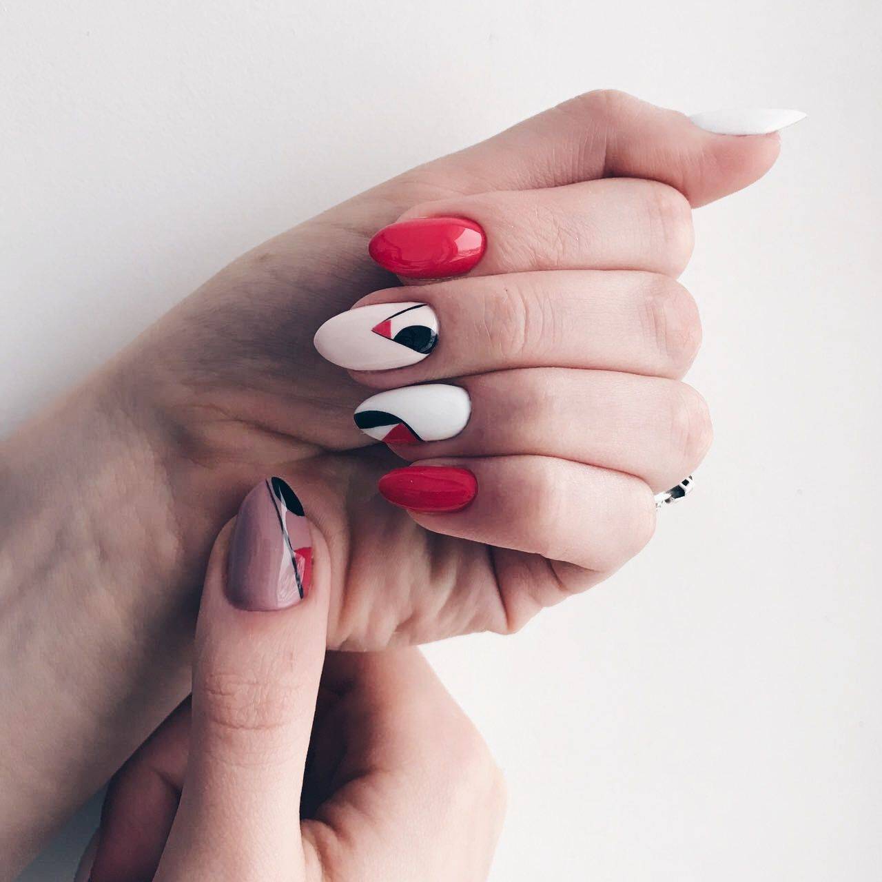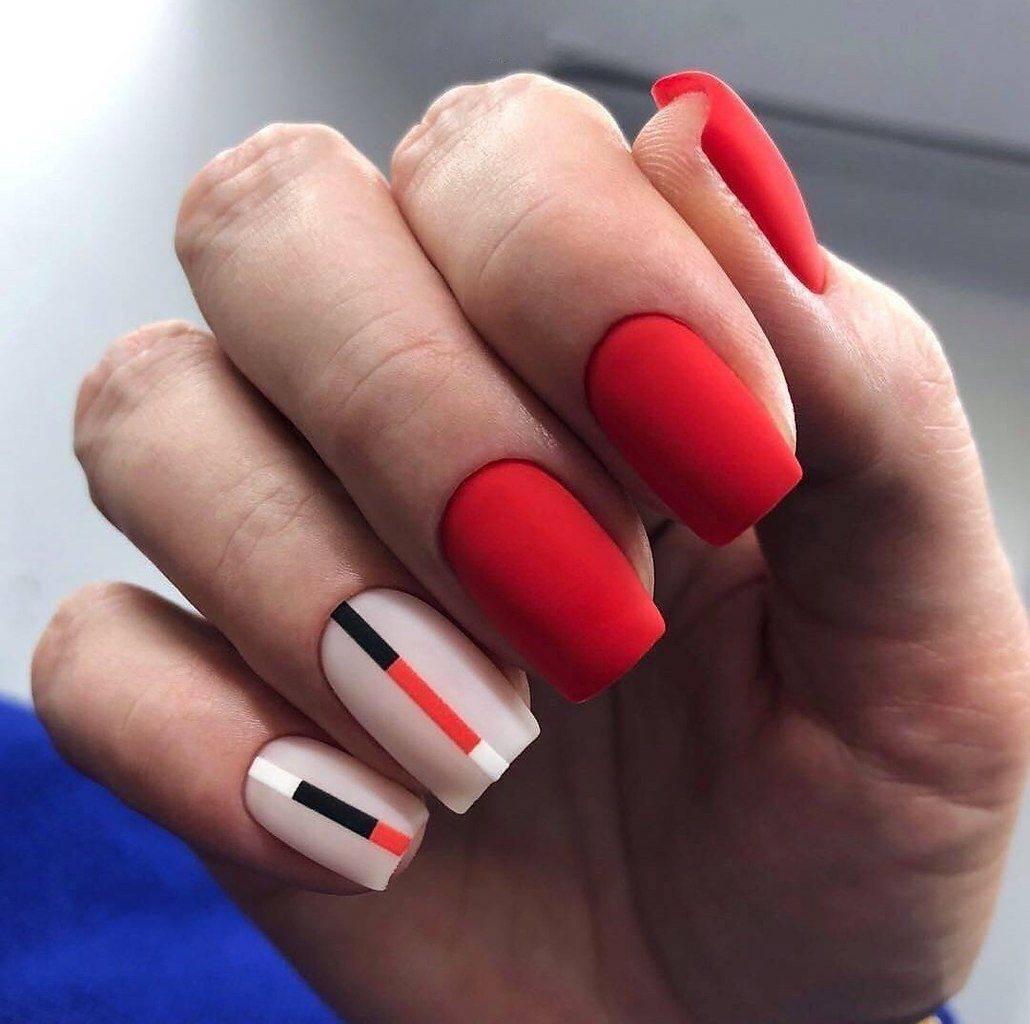 Геометрические мотивы позволяют исполнить стильный красный маникюр с рисунками фигур, точек, линий. Рекомендуем использовать также белый лак в тандеме с красным, что придаст легкости и ненавязчивости красному дизайну ногтей 2021-2022 года.