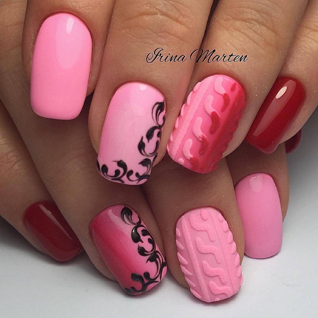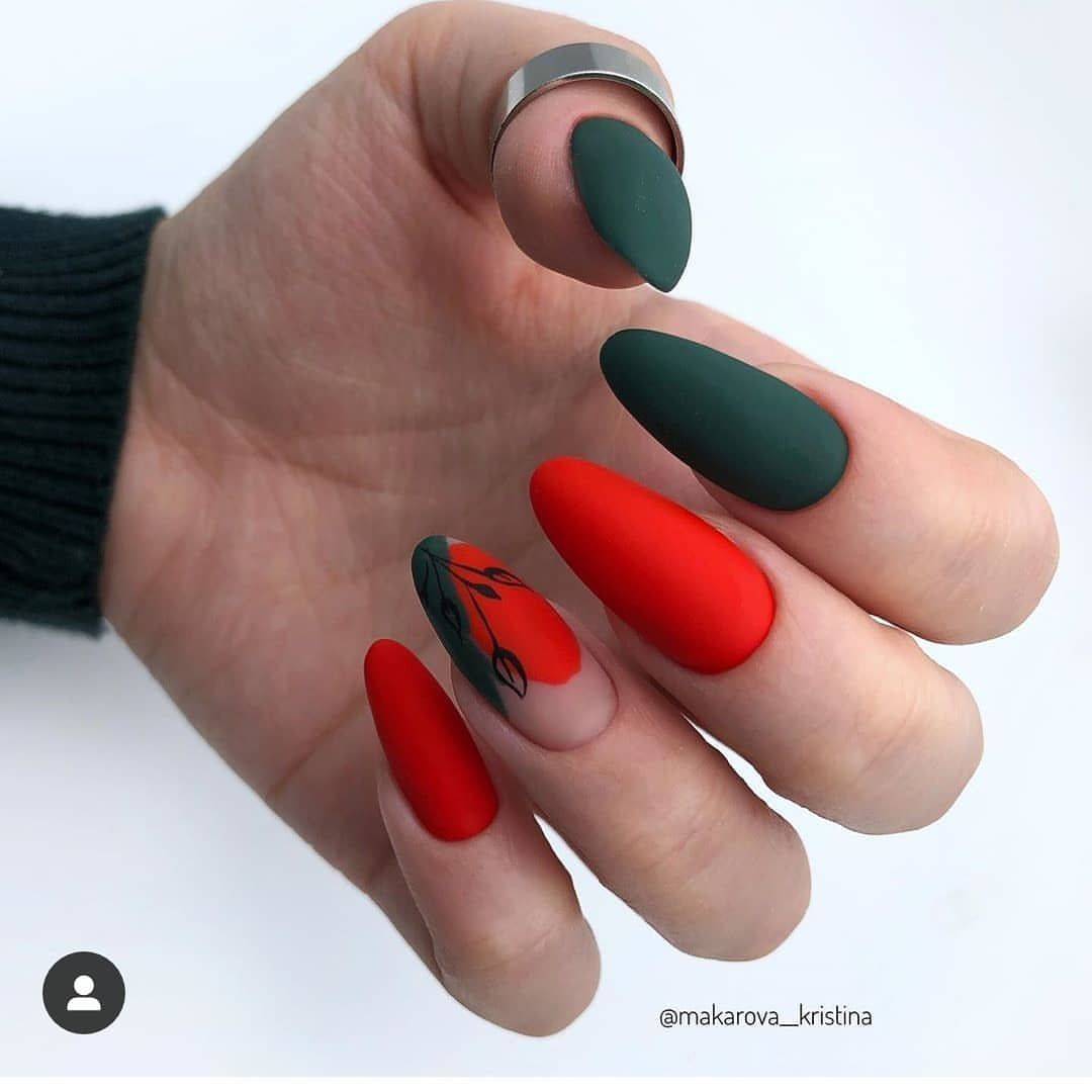 Вариант сложный, подойдет не каждой даме, поскольку цвета плохо гармонируют между собой. Для создания красивого дизайна применяют связывающие элементы в виде дополнительных оттенков: нежно-зелёного, чёрного, белого, серого. В качестве украшения красно-розового покрытия акцентируют безымянный палец объёмным рисунком.