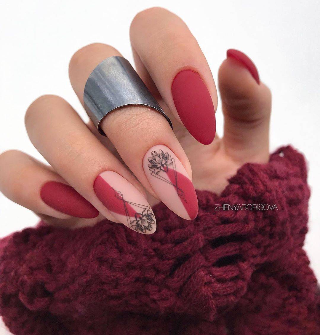 Бордовый маникюр сочетается с вязаным узором, цветочными рисунками, импрессионистическими метаморфозами, этникой, абстракцией, геометрией.