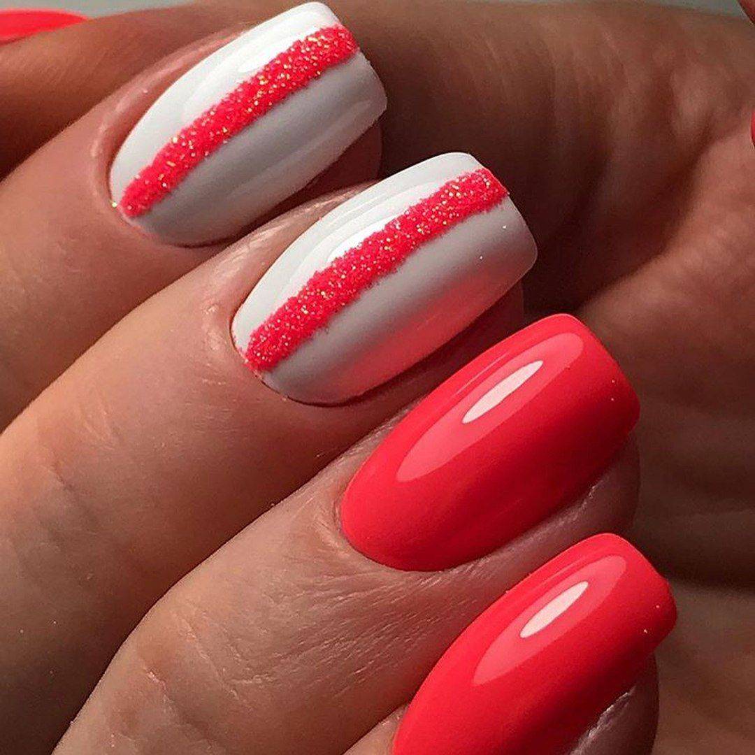 Красно-белое сочетание всегда беспроигрышно. Светлый цвет умиротворяет страсть красного. Маникюр будет уместен как для торжества, так и для работы. Трендом 2019 года является коралловый глянец, который в сочетании с белым рисунком смотрится непревзойденно. Для усиления эффекта изображается рисунок белой гель-пастой или песком. Они придадут объема дизайну.