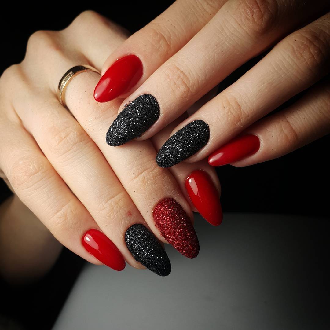 Женщины, жаждущие выделиться на фоне окружающих, часто совмещают красный и чёрный оттенок. Сочетание визуально увеличивает ноготь, делает его форму более вытянутой, изящной. Есть 2 способа комбинирования цветов: