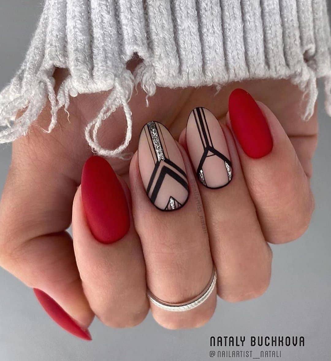 Красиво смотрится на ногтях в красной гамме нейл-арт в стиле геометрия, что довольно лаконичен, сдержан и прекрасно завершит дизайн ногтей в красном цвете для офисного выхода и на каждый день.