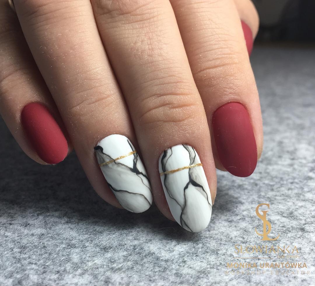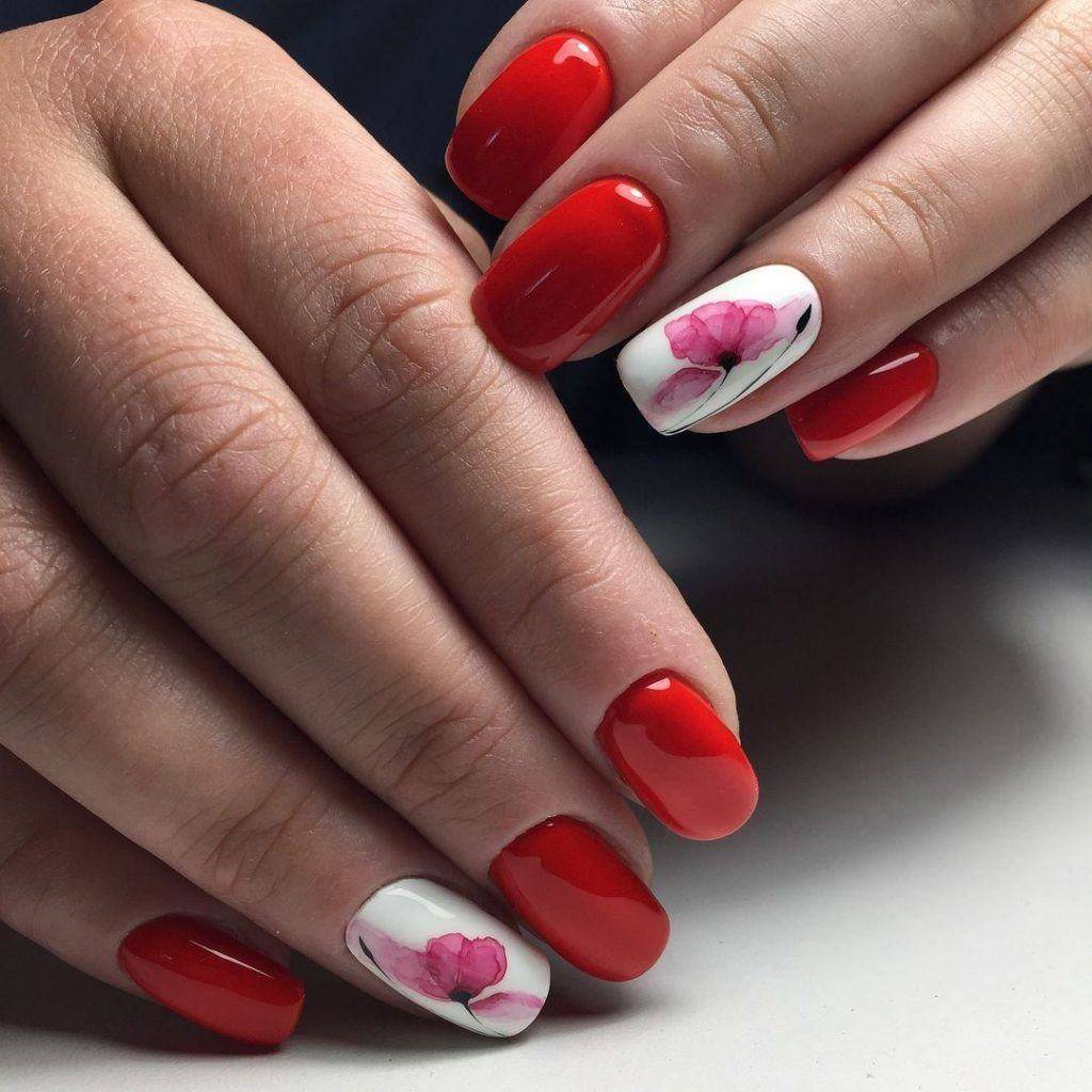 Белый цвет используется в качестве фона для нанесения флористики, геометрии, мраморного декора, абстракции. Визуально сочетание красного и белого смотрится объемно и насыщенно. Присмотритесь к французскому маникюру, где край ногтя выделен красным цветом, а остальное пространство ногтя окрашено белым цветом.