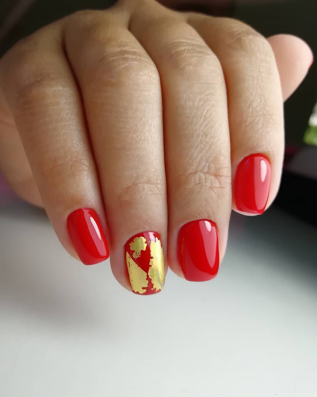 Красный и золотой прекрасно дружат. Данное сочетание можно отнести к классическому. Однако оба цвета слишком яркие для ежедневной носки. Торжественные мероприятия, праздники больше подходят для напыщенного маникюра. Выполнять работу можно различными техниками. В этом году нейл индустрия предлагает нам использовать фольгу и ленты-наклейки. Отпечаток золота или геометрическая задумка на безымянном и среднем пальцах сделают ярко-красное оформление еще выразительней.