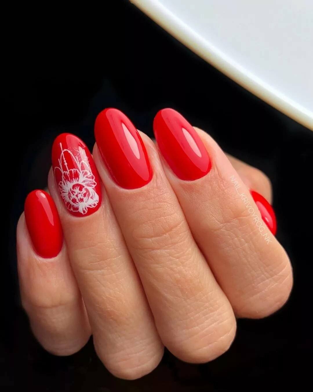 Цветовые решения также могут быть самыми разнообразными. Чаще всего используют классические оттенки, которые лучше всего гармонируют с красным. Это могут быть белые узоры, дополняющие маникюр особой нежностью и чувственностью.