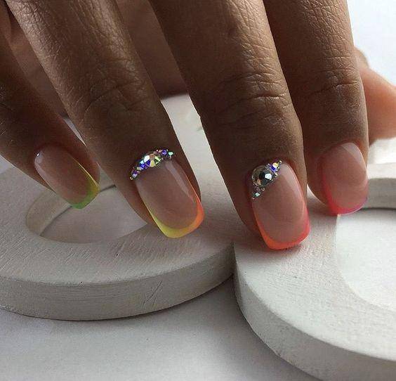 - Смелый оригинальный летний френч, сочетающий в себе цветную лилию ногтей и смешение цвета пластины;