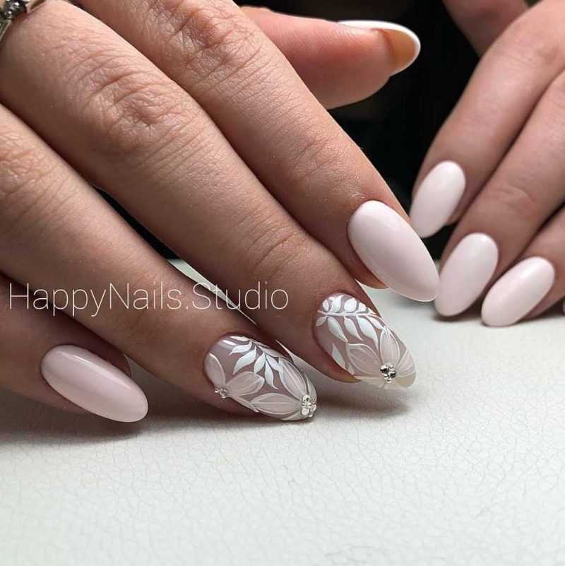 Маникюр на 1 сентября нежный. Красивый белый маникюр на миндальные ногти с объёмным рисунком.
