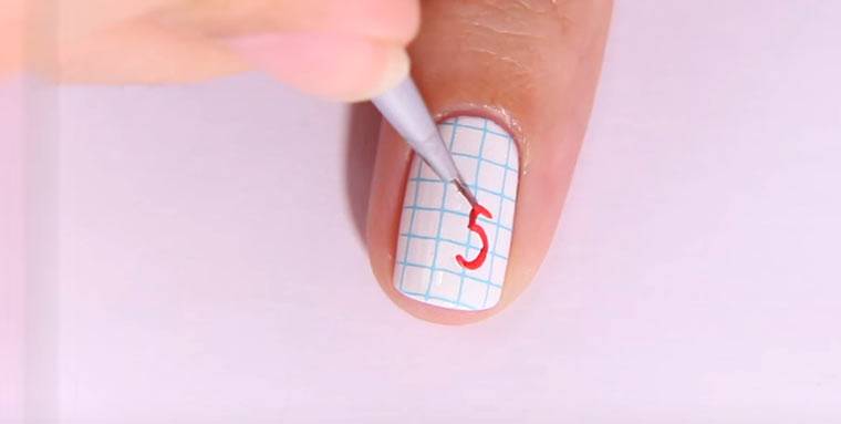 12. Далее раскрашиваем как клетчатый лист с помощью штампа или от руки. И рисуем тонкой кисточкой пятерку.
