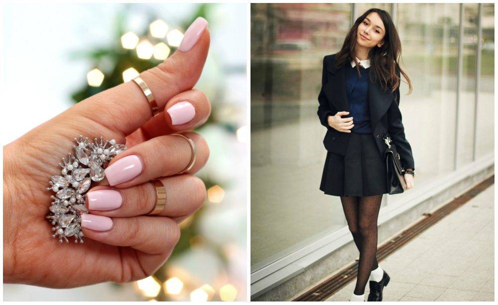 В случае, если ваш look прост и подобран в стиле минимализма и классики — вы можете позволить себе более сложные акценты на ногтях. К примеру, крупные камни и объемные инкрустации из страз, французский маникюр блёстками и т.п. Такой маникюр будет вполне уместен при умеренном стиле в одежде и причёске.