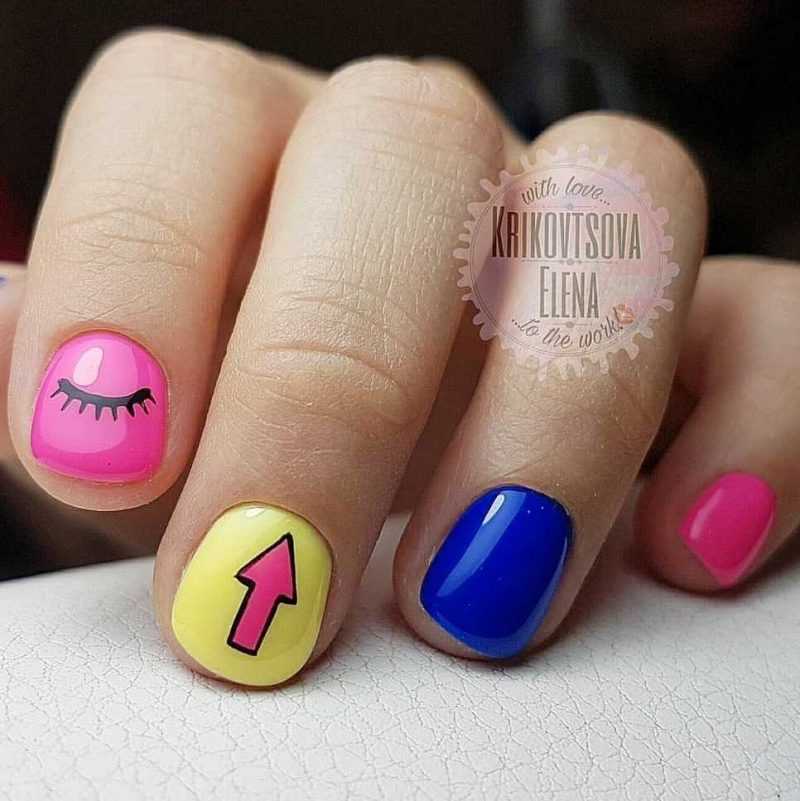 Прекрасной идеей будет оформление каждого ногтя в разном стиле, но с учетом единой пастельной палитры. В таком дизайне можно взять за основу игру фактур, простые линии, вставки в технике «негативное пространство» и очаровательный рисунок в горошек.