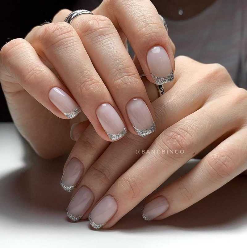 Маникюр на первое сентября с серебристыми блёстками. Нежный и простой дизайн ногтей на нюдовом лаке.