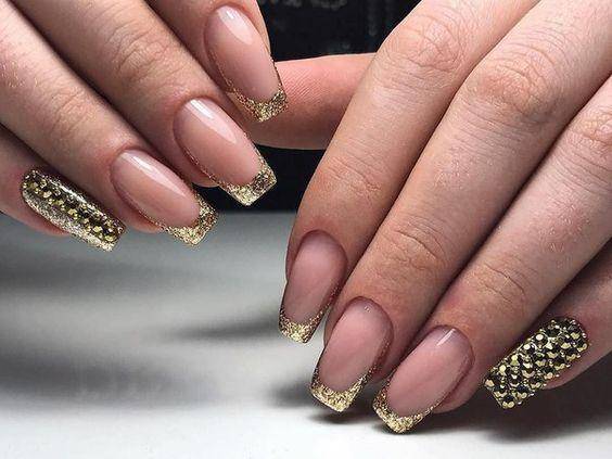 - Максимум, что можно использовать- серебристый или золотистый глиттер, но им не стоит покрывать все ноготки, а можно лишь сделать ненавязчивый акцент, покрыв им один из пальчиков.
