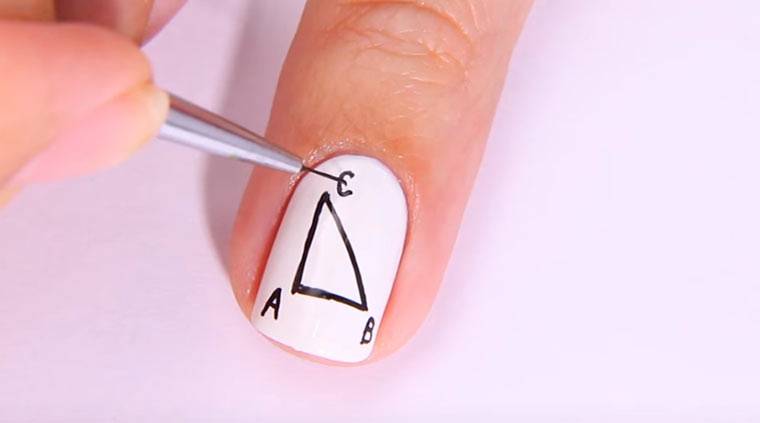 9. На среднем пальце тонкой кисточкой нарисуйте треугольник и подпишите вершины: А, В, С.