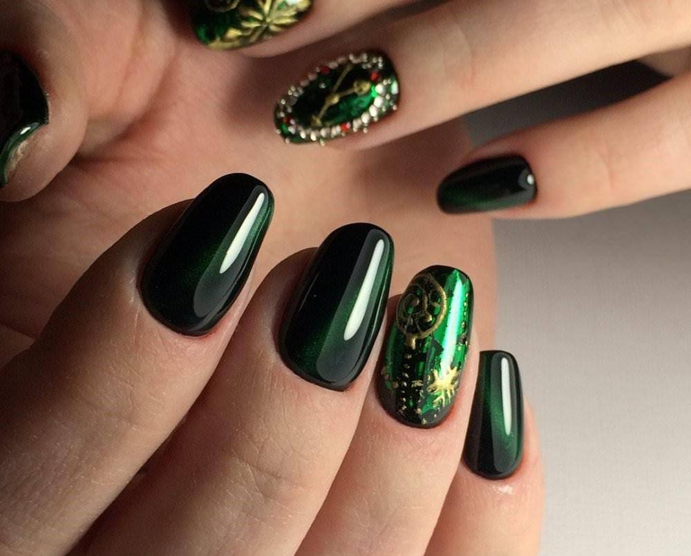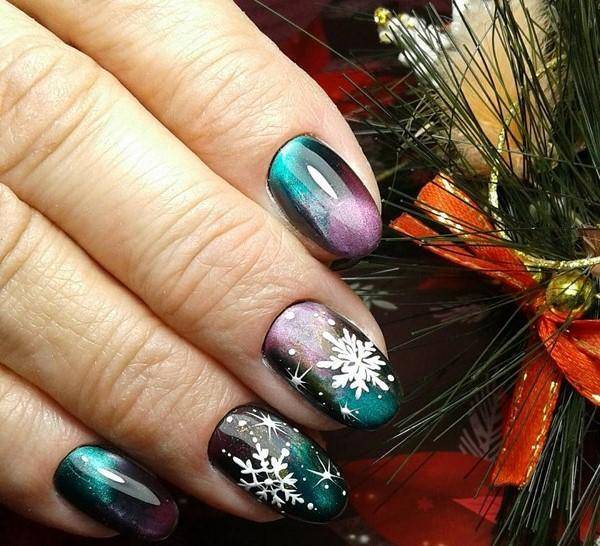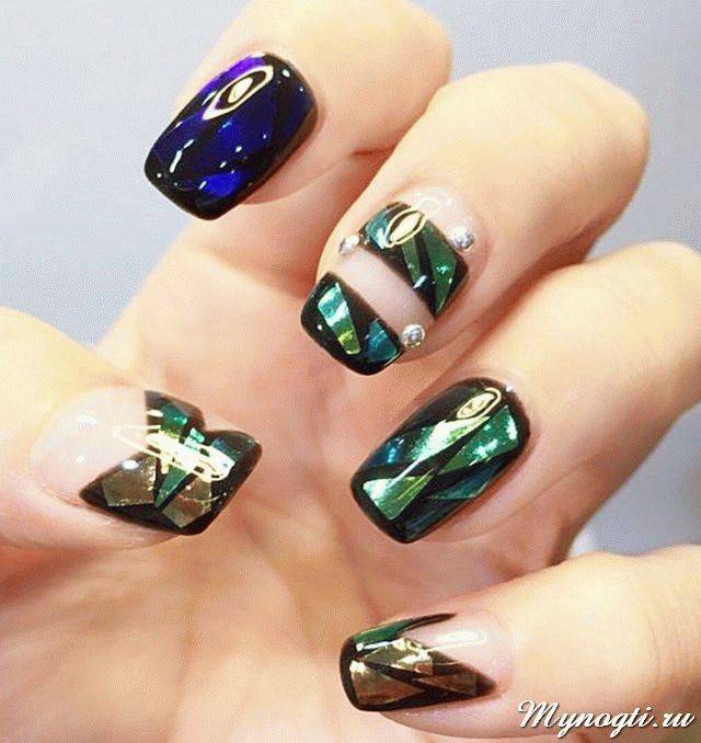 Для посещения вечеринки можно нагромоздить страз побольше, тем самым привлекая внимание общественности мерцанием своих непревзойдённых ноготков;• зеркальный эффект – очень актуальный вид дизайна, когда, помимо гель-лака, на ноготки наносится втирка из россыпи блёсток, измельчённых до размера пылинок; то, что получается в результате, можно назвать шедевром нынешнего нейл-арта, потому как блеск и отражаемость данного покрытия смотрится поистине аристократично;• кошачий глаз – использование специальных магнитов для воссоздания знаменитого эффекта пришло к нам уже давно, и не первый год подобный дизайн пользуется популярностью среди женщин; магическое сияние и завораживающая глубина пространства, создаваемого с помощью эффекта кошачьих глаз, поражает волшебством своего вида.