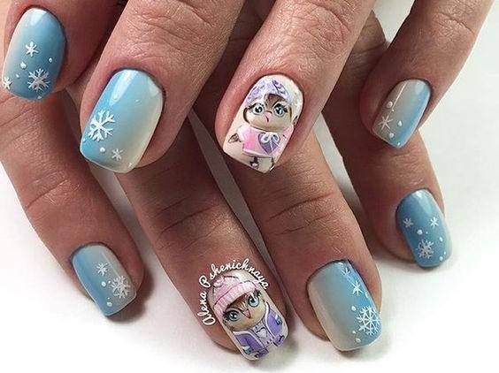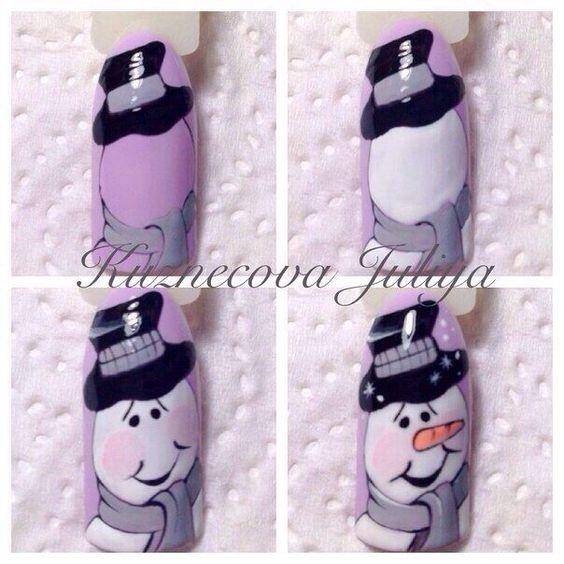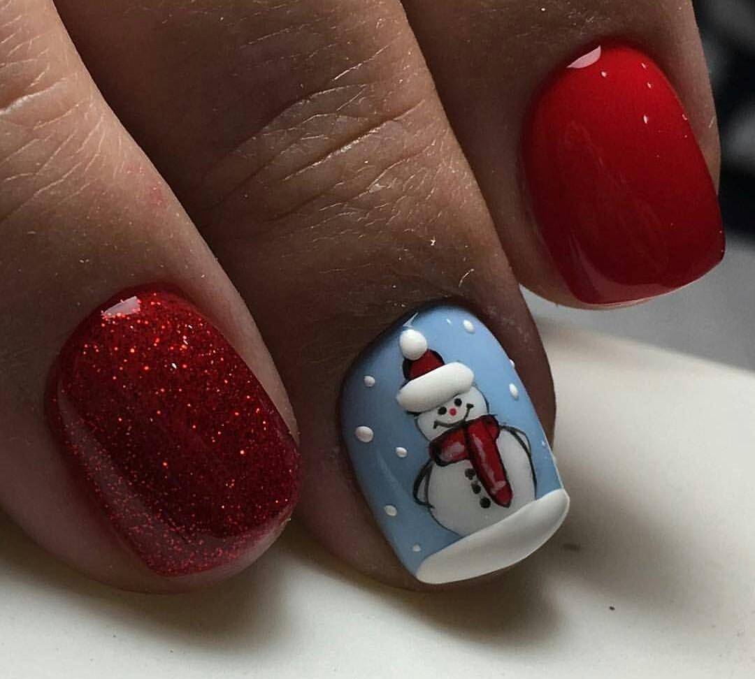 Куда же без этого весельчака?! Снеговиков в маникюре изображают прорисованными до деталей, или схематичными набросками. Обычно они с метлой, в шарфе и шапке. Обязательно нос морковкой или камушком. Любителям самого позитивного и яркого дизайна ногтей можно предложить вместе со снеговиком нарисовать забавного деда мороза или символ предстоящего года – белую крыску.