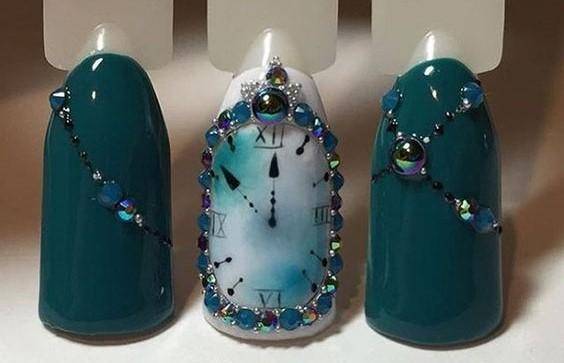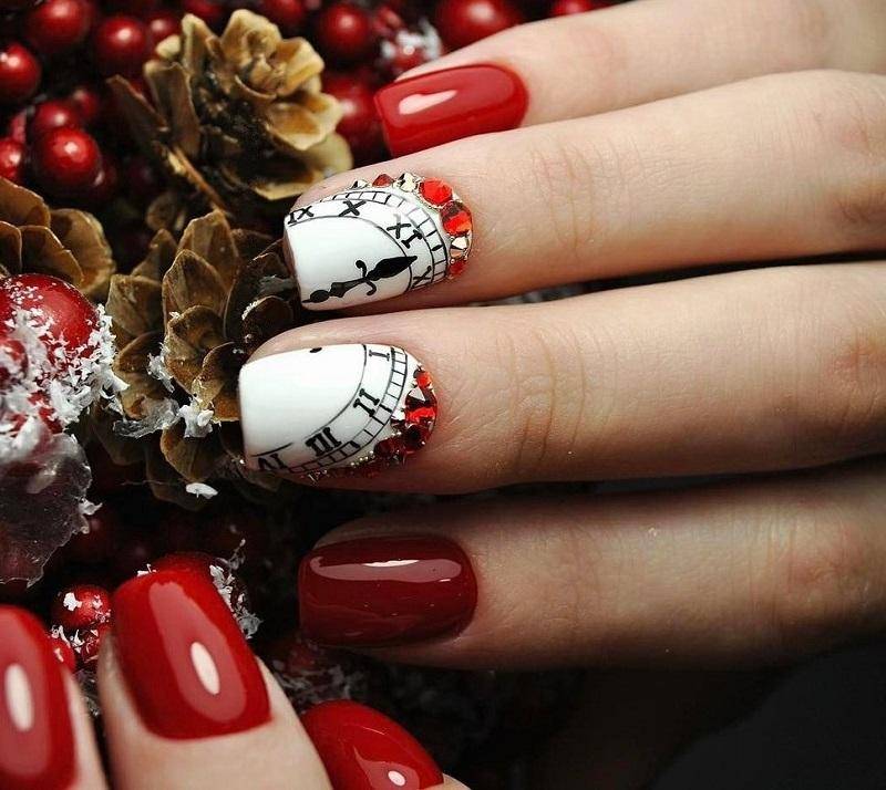 Встретить 12 часов ночи за праздничным столом славная традиция нашего народа. Поэтому и тема часов на ногтях так популярна. Можно нарисовать циферблат, стрелки которого вот-вот пробьют полночь. Как в той песне: 5 минут, 5 минут…