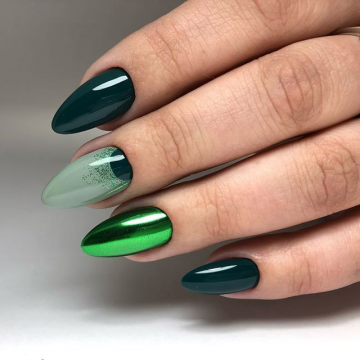 Ультра модному маникюру не уступают в популярности цветовые переливы и переходы. Актуальным остаётся эффект – кошачий глаз. Градиент может иметь направление вертикальное, горизонтальное или по диагонали, цветовые волны, которые занимают всю поверхность ногтя, и те, что наносятся только на часть – например, лишь кончик свободного края ногтя имеет светлый оттенок основного цвета.