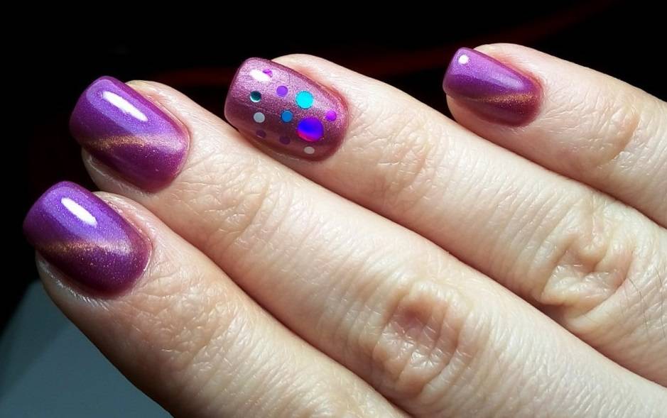 Небольшие поверхности лучше украшать маленькими конфетти, особенно удачно смотрятся геометрические фигуры – ромбы, квадраты, треугольники и круги. Крупные камифубики на коротких ногтях будут выглядеть вычурно и визуально уменьшать пластины. Аккуратные пайетки подчеркнут изящность дизайна, зрительно сделают руки и пальцы более утонченными.