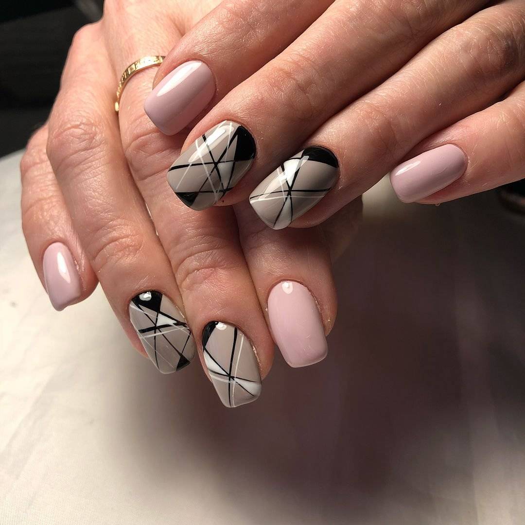 Ну и конечно же, стильная и лаконичная геометрия. Комбинируя линии разной толщины и несколько контрастных цветов на ногте, можно создать интересный дизайн в технике «паутинка». На фото ниже можно рассмотреть самые интересные на наш взгляд дизайны для коротких и длинных ногтей.