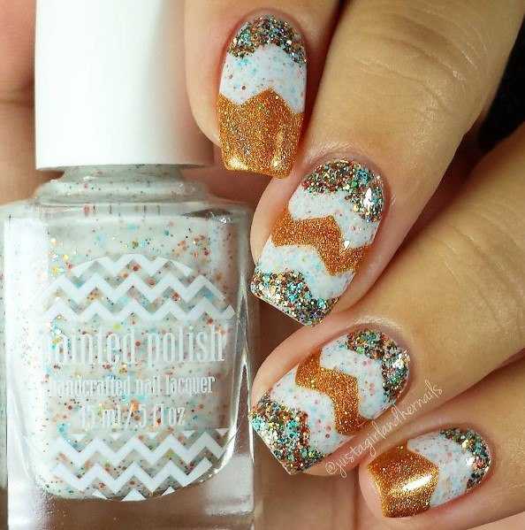 - Золотистый блеск. Его используют, когда надо обвести ноготок или линию улыбки по краю, создать полоски, вертикально или горизонтально волны на ногте.